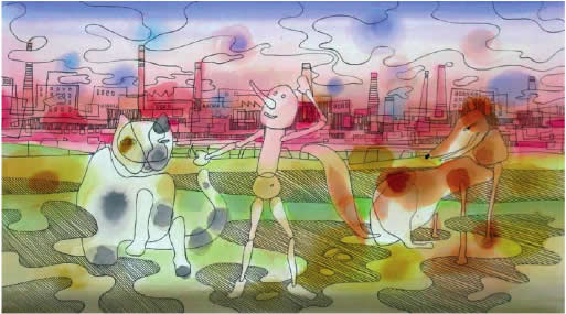 Se il Pinocchio collodiano prende forma e vita da un pezzo di legno dei monti toscani, PinOkio di Grzegorz trae la sua forza da un immaginario urbano, forse quello della sua città d’origine, Lodz, dalle grandi distese, dalle strade larghe e lunghissime che la attraversano. Nonostante alcuni tratti di tante figure che si accampano sulla carta con la celerità e la vigoria propria della gioventù, denuncino reminiscenze accademiche dai grandi maestri del Novecento, è la capacità di reinterpretare il racconto affabulante, il segno più connotativo, emozionale delle sue opere.