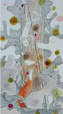 PinOcchio a Lodz è il racconto iconico di un amore che coinvolge i bambini di ogni latitudine, che come ribadisce nella nota prefativa al catalogo, Agnieszka Zakrzewicz, pensano che “Pinocchio sia nato e vissuto nella propria città natale”. Grzegorz ci restituisce il suo PinOcchio, disegnato a china, utilizzando uno strumento quanto mai desueto, il rapidografo, nel dimenticatoio dei tempi moderni, e i colori ad acquarello in modo da far comparire sui fogli, quasi fanìe visive contemporanee, le figure delle favola non più italica.